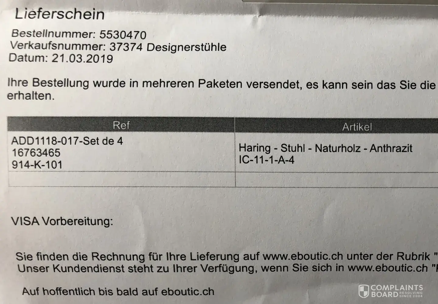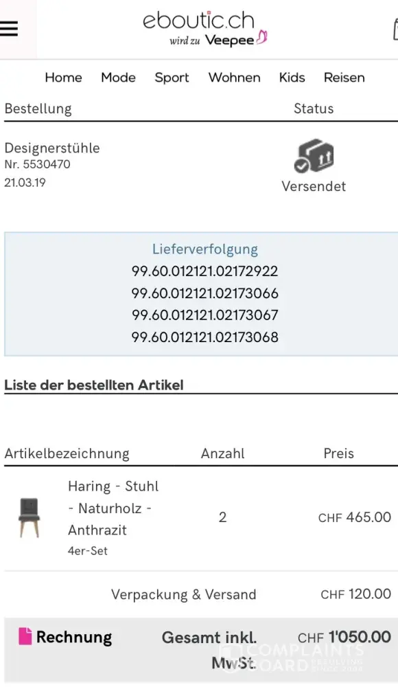 I received the wrong type of chairs and want you to arrange their collection back at your cost as soon as possible and return my money - 1050 CHF in full as that is an obvious mistake of the supplier or wrong presentation of the goods - see the photos attached. These chairs are on offer on your website again: https://www.eboutic.ch/sale/37375/all/510698.