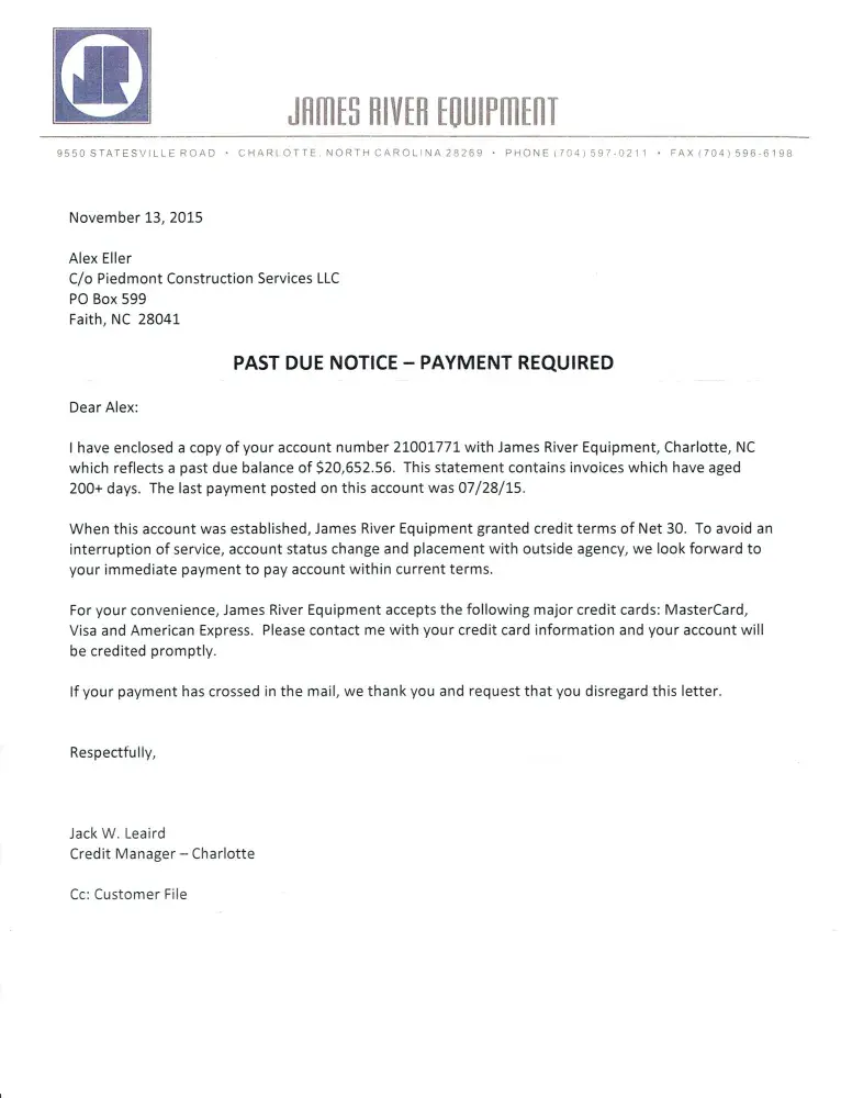 As of Jan 2016, we were contacted by Vericore to settle a debt with James River Equipment - Charlotte. Our company has been trying to work out charges with James River due to issues on a product we never picked up & also with charging warranty work on repairs. We have been in contact with James River to resolve these issues & during that time we apparently...