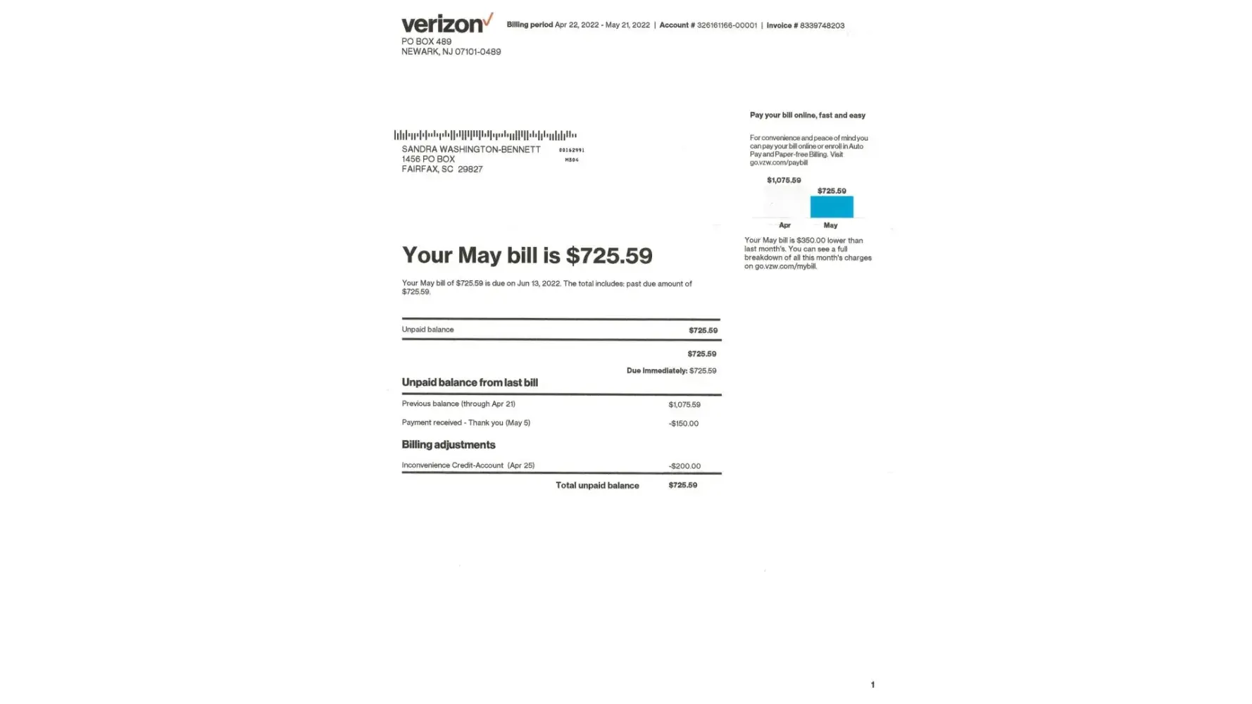 Verizon bills: Dec. $77.70, Jan. $77.63, Feb. $170.26, Mar. $136.14, Apr. $59.16, May $-59.16, June $-118.01 Bills Totaling $ 461.73 I was given a credit on the next bills totaling: $ 177.17. I was told they would refund $170.26 also but I had to pay June $52.25. Each time I called different answer. My bank called and verified the withdraws, Verizon said twice now that they would refund