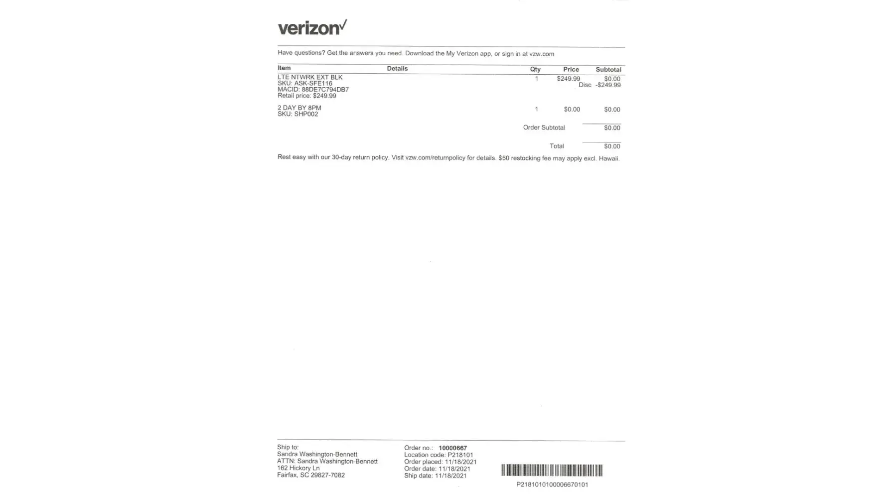 -- Verizon’s response: “We don’t compensate for inconvenience.”