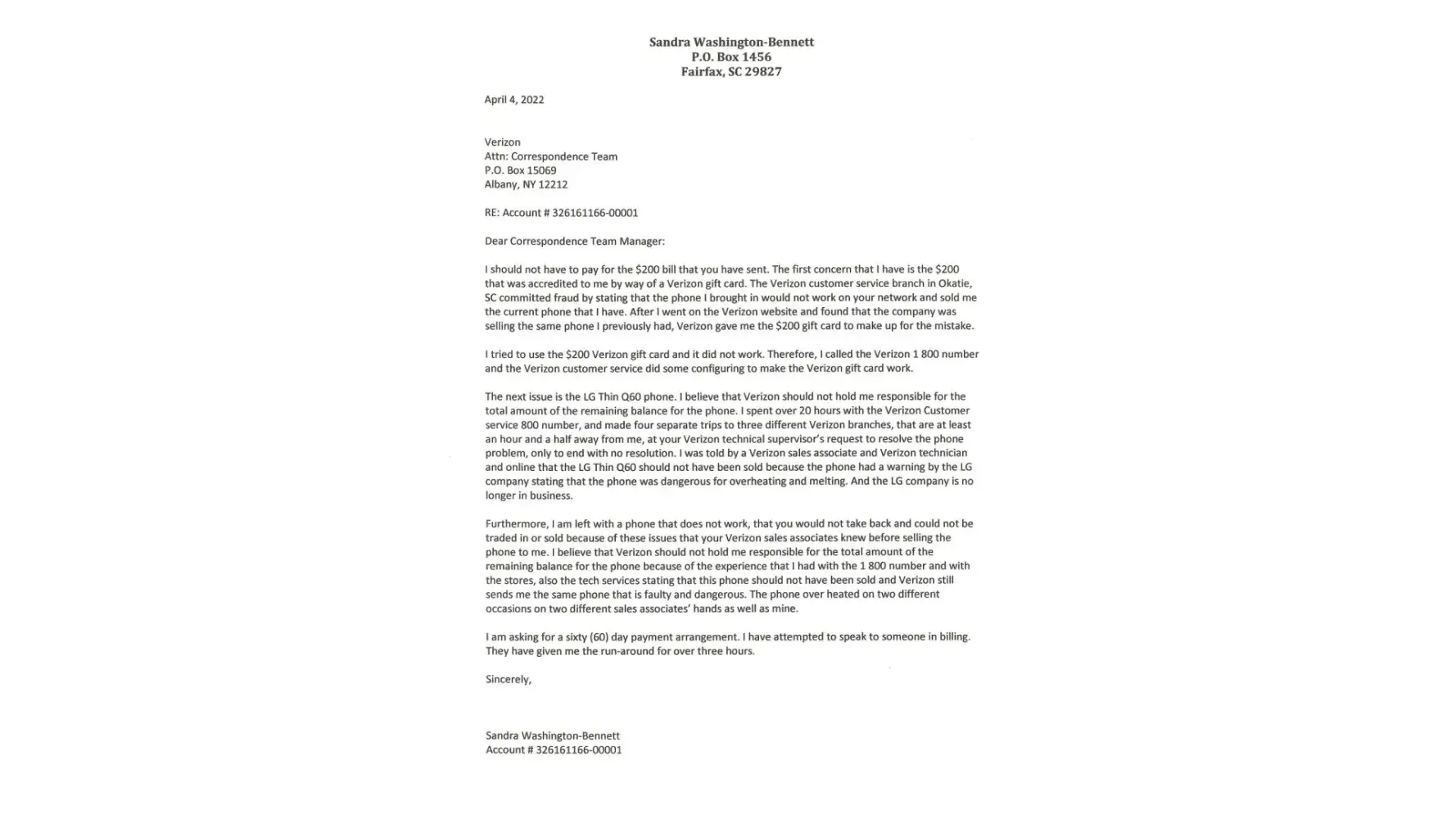 I want to resolve this issue with Verizon and not have to pay for a phone nor services that I no longer have. I am sending this letter with a copy of a formal letter of complaint to Verizon, a copy of returned receipt for a Verizon Wi-Fi booster, Convergent debt collections with an outstanding balance, Verizon bill adjusting the collections amount, two FedEx receipts from mailing unwanted phones, all concerning Verizon who is threatening to damage my credit after numerous attempts to solve a problem with Verizon who has defrauded me since the beginning of the contract I had with them. They had given me a refund of $200 consigning to the fact that they were in the wrong. Furthermore, they promised to receive the phone back and delete the cost of the phone from my account. I had to travel back and forth to Walterboro, Bluffton and Charleston, SC to four different Verizon stores which has taken approximately over 10 hours, informed of appointments with each different store in an attempt to return the phone and to resolve the issues. Once arriving at the stores there was no appointment made by the company. I then had to use FedEx to send the phone back after numerous attempts to receive a working phone that would not burn my hand as I used it. I had canceled my contract with them in April. That was my last attempt to take the phone off my bill. I called to confirm that the cost of the phone had been removed but an associate stated that the company did not do as they promised. Verizon kept the phone and the problem was not resolved.