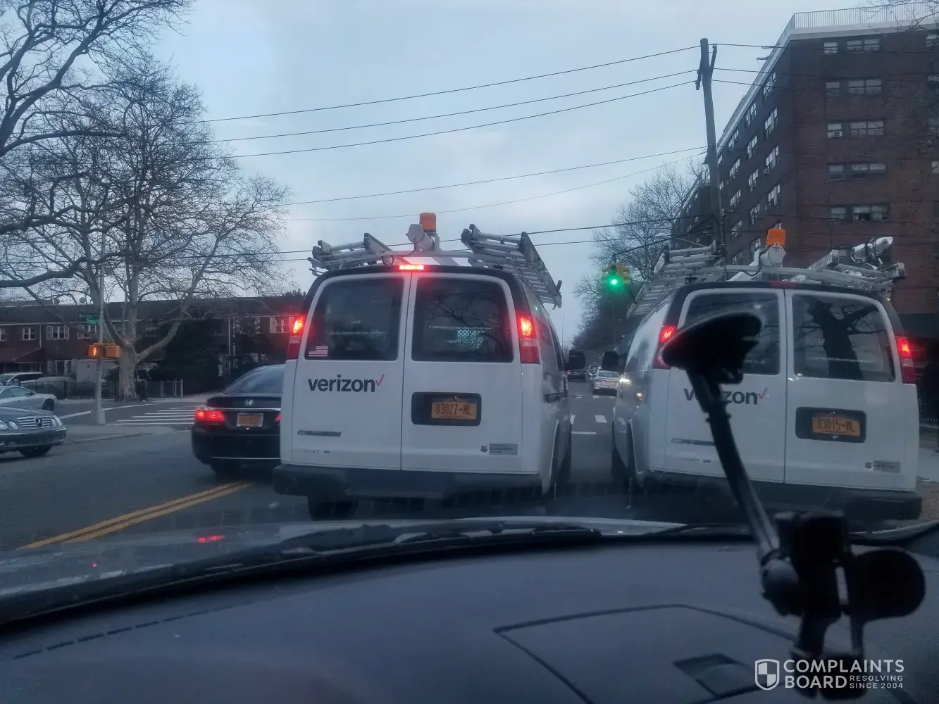 Two of your Service Technicians have been double parked for the past half hour in a very busy intersection located at 893 Schenck Avenue and almost caused someone to hit my car because they are busy bull crapping while double parked. Thats not cool and its also dangerous to me and other people in the neighborhood. The three photos is me in my car trying to get around them and they dont care that people are honking. The video I video once I got out of my car and went inside my apartment building and they started to leave.