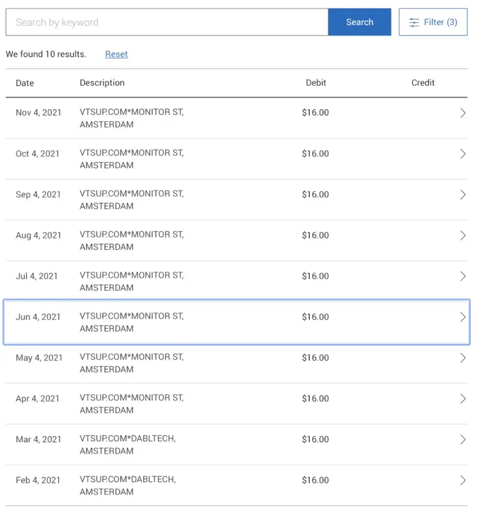 My credit card (VISA) was charged $16.0 each month by VTSUP.COM since February 4. 2021 till November 4. 2021 without any reason!