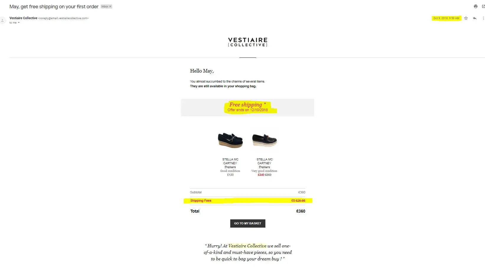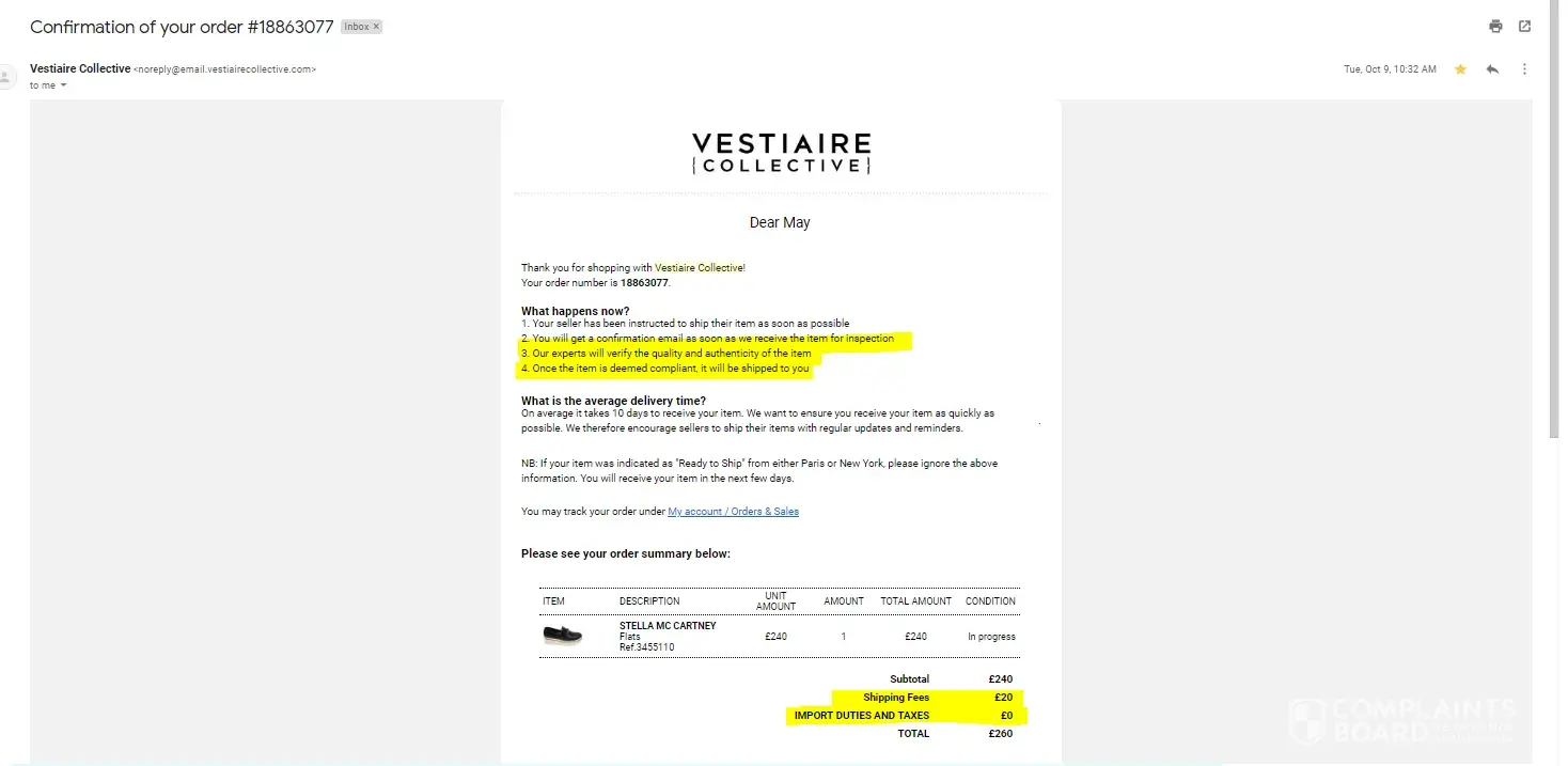 I purchased a pair of used Stella McCartney Binx loafers for £240 on 09/10/2018 (Ref 1886307). The website provided the option of £20 shipping fees as flat rate and advised the item would be shipped from Hong Kong to Paris for Quality Control then shipped to London from London. I also received an email which stated I had free shipping offer which would end on 12/10/2018 but this was incorrect as I was charged £20 upon checkout. I was not given the option to choose to pay the flat rate or import duty tax instead.