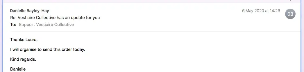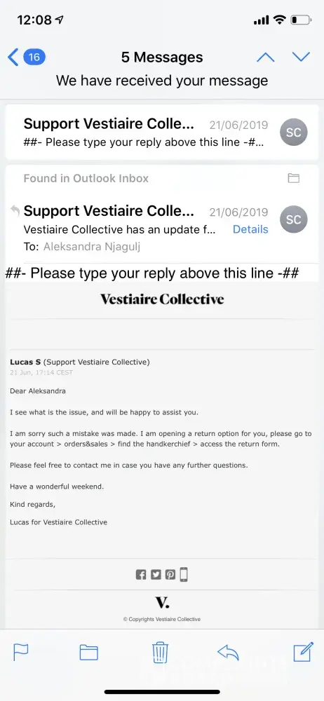 I purchased a faulty item from Vestiaire Collective and upon receipt of the items the shoes were dirty and had pen marks on them that were not included in the listing. I emailed them on 11/06. "I purchased three items under [protected] and two of them are not as expected. The shoes are dirty/more worn than the description and the dress shows signs of fade on the colourblock area? I've ordered from Vestiaire a number of times and never had problems like this. Can you please let me know what my options are? The items are still in their packaging with the tags attached."