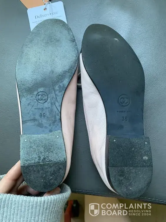 The first image is what i received and the second is what was advertised. These are two different shoes (in first photo). The left shoe's sole is a different texture, color, and the "made in italy", Chanel logo, and size that's emblazoned on the shoe is different. They're also different sizes; my left foot (which is naturally smaller than my right) hurts when I put the left shoe on while my root foot/shoe is completely fine. The company thinks there's no real difference between these shoes, that the sole was just cleaned with a "wet towel" and refuses to allow me to return the shoes despite them clearly being different than what was advertised, and despite the left and right shoes that I received clearly being different.