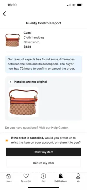 I sold a Gucci pochette bag on vestiaire. Their so-called expert stated in a quality control report that the handle was not original. This bag was purchased new by myself and barely used. I sent them the receipt and asked them where did they identify that handle was not original (I attached their report of trouble area as well as my close-up pictures for that trouble areas, which show clearly nothing have been ever altered, all are original). Since the bag is authentic, original, never being altered, repaired or replaced. I even attached my Gucci email shipping notification when I ordered my bag. No response. What does the so-called expert do? Do they even qualify as expert to make a mistake like that? I won't be surprised if the other way around, let fakes slip through their so-called quality control. Shame on you and your experts! Definitely dishonest, disqualified and unethical, un professional.