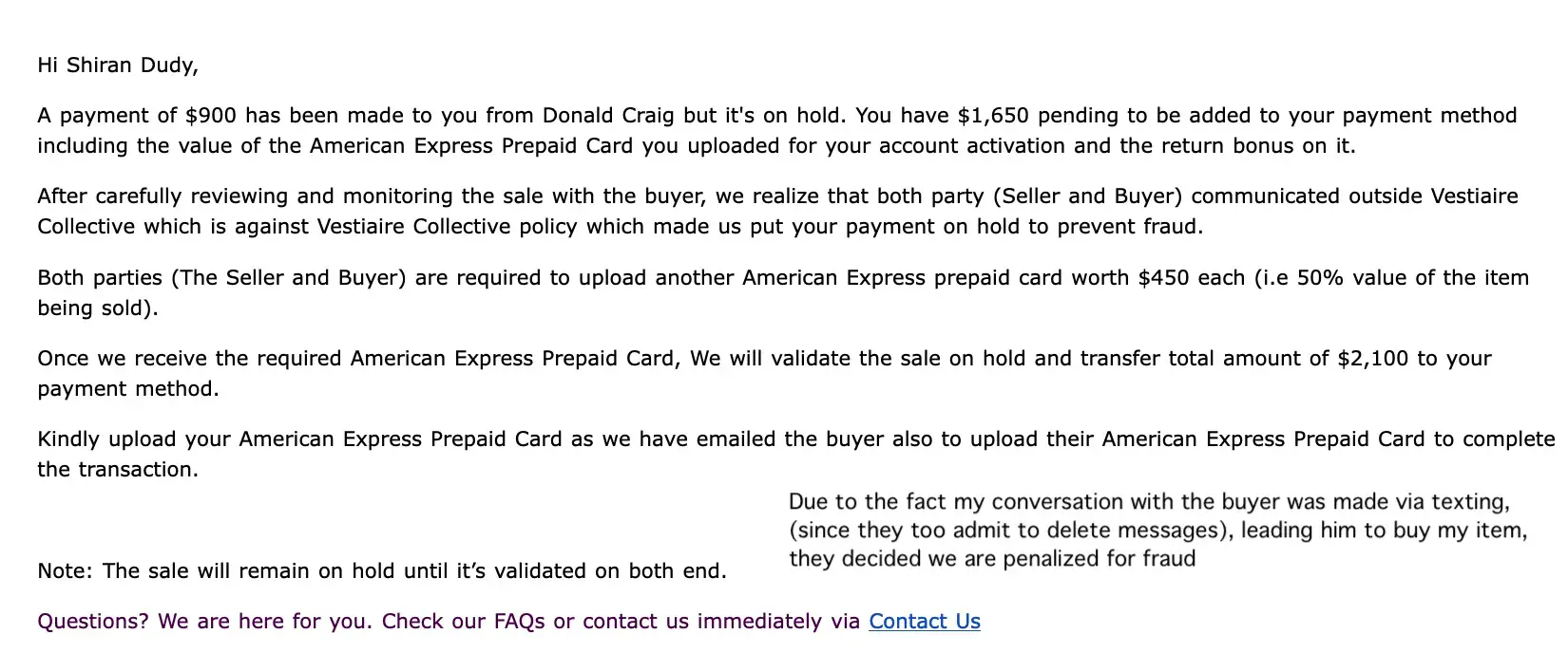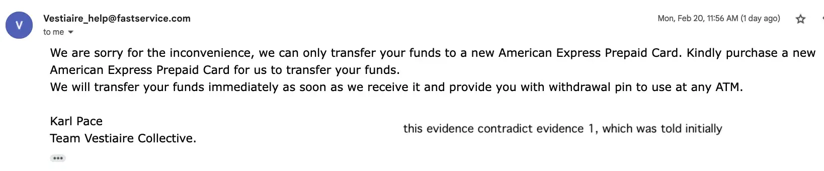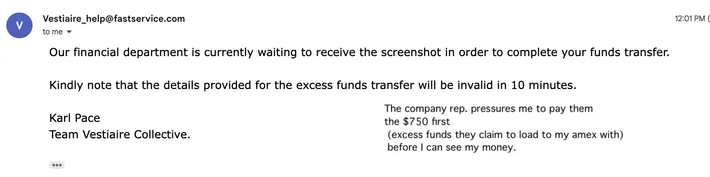 To Whom it May Concern, I went through a scam incident with Vestiaire Collective company. I can share with you the email thread I have, but for now I will provide an overview of the case. All actions I made, required loading American Express prepaid gift card (which I will refer to as Amex) with funds, and being told I will get my funds back once I go...
