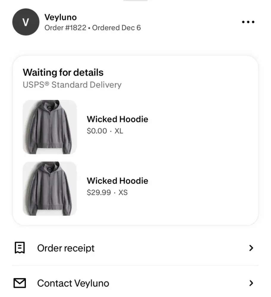 On December 6, 2023, I placed an order on the website veyluno.com for a WICKED hoodie under a promotional Buy 1 Get 1 Free offer. As an excited customer looking forward to receiving my items for Christmas, I was optimistic about my purchase. However, my experience quickly turned into a frustrating ordeal. After placing the order, I did not receive any...
