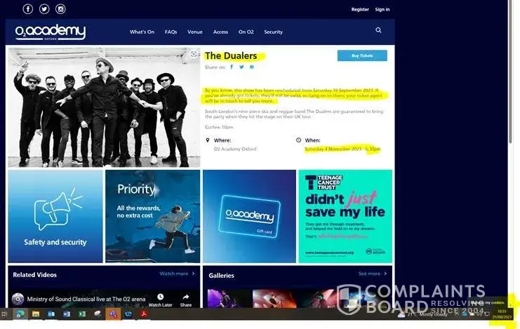 It stated that my tickets were confirmed but I would not receive tickets until 16th September (which is the date I had booked the tickets for). I then went on to the venues website to check details and this gig was not even listed for 16th September. It has been rescheduled to the 4th November (which is a date that I am unable to make).