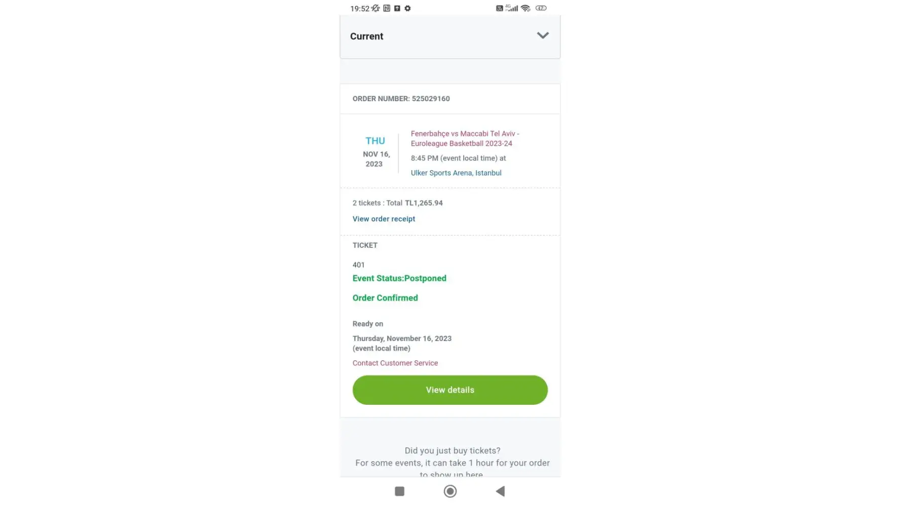 I bought myself a ticket for Fenerbahce - Maccabi Tel Aviv basketball match which was to take place in Istanbul at 16.11.2023.