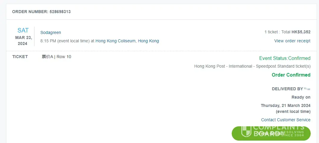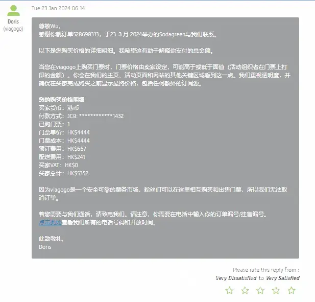 I bought the ticket of Sodagreen Saturday, March 23, 2024 | 20:15 Hong Kong Coliseu. After I paid out I found it took me too much fees I didn't see them before. And ticket price was 3-4 times higher than normal ticket price but I didn't know it before I paid. Then I contact the customer service and they refuse my request.