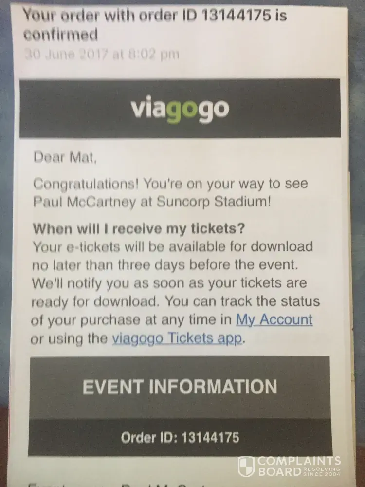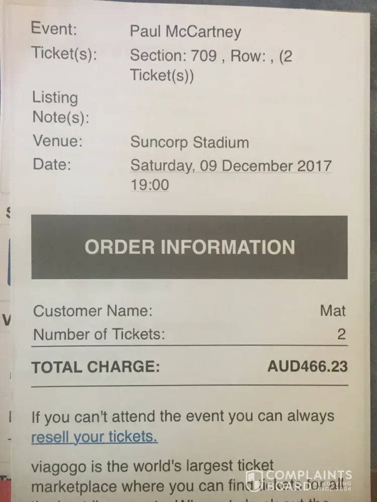 Six months prior the concert, I purchased two Paul Mc Cartney tickets for $466.23 au and then found my Viagogo account had been deleted from their system, not allowing me to log into it and download or print my tickets