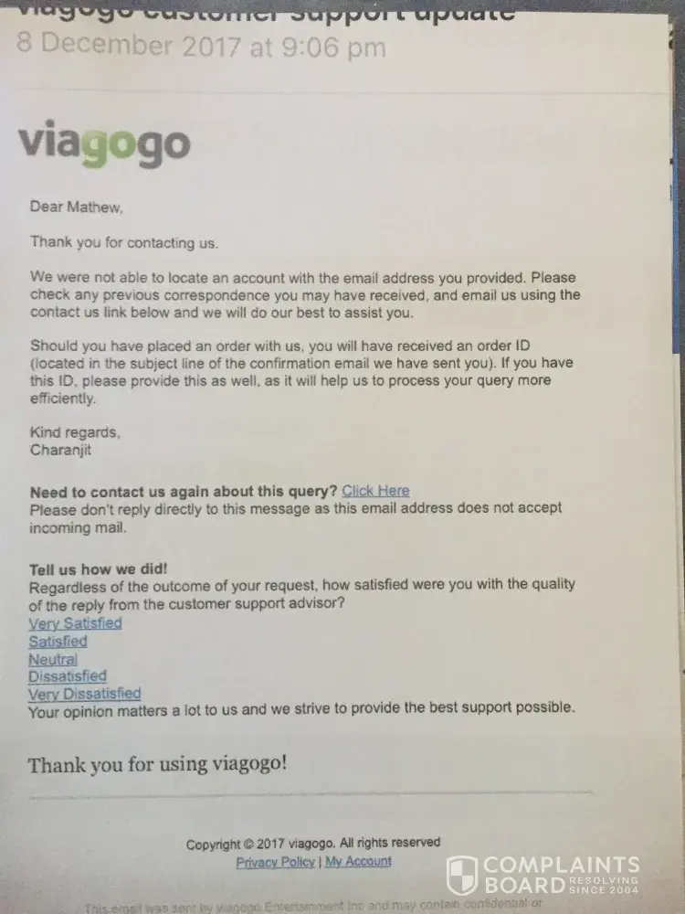 When I tried to log onto my account with the same login details it said it was not valid. When I contacted Viagogo I got a response saying my security check could not be validated and my account had been cancelled?