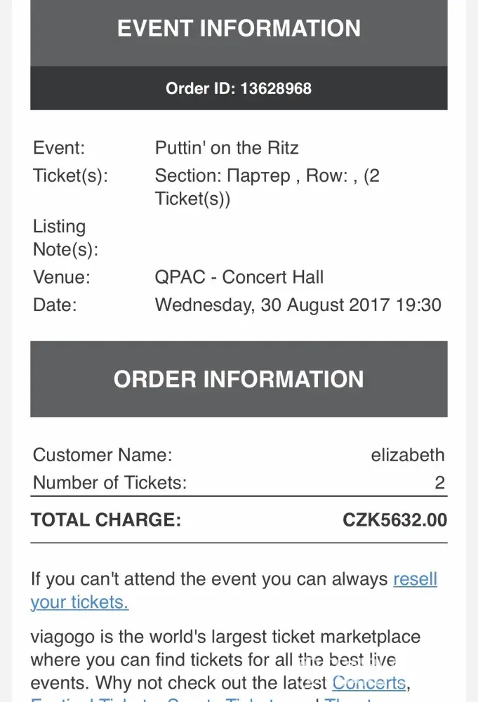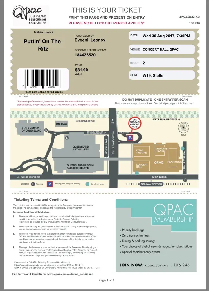 Purchased 2 X $81.90 for "Putting on the Ritz" Qpac Brisbane