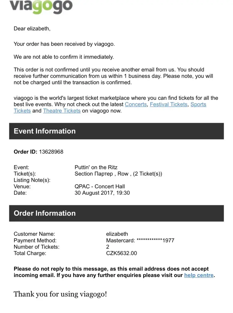 And when I replied to the Welcome to Viagogo email it bounced back as undeliverable - twice - and it was not a no reply email. This is also not great customer service.