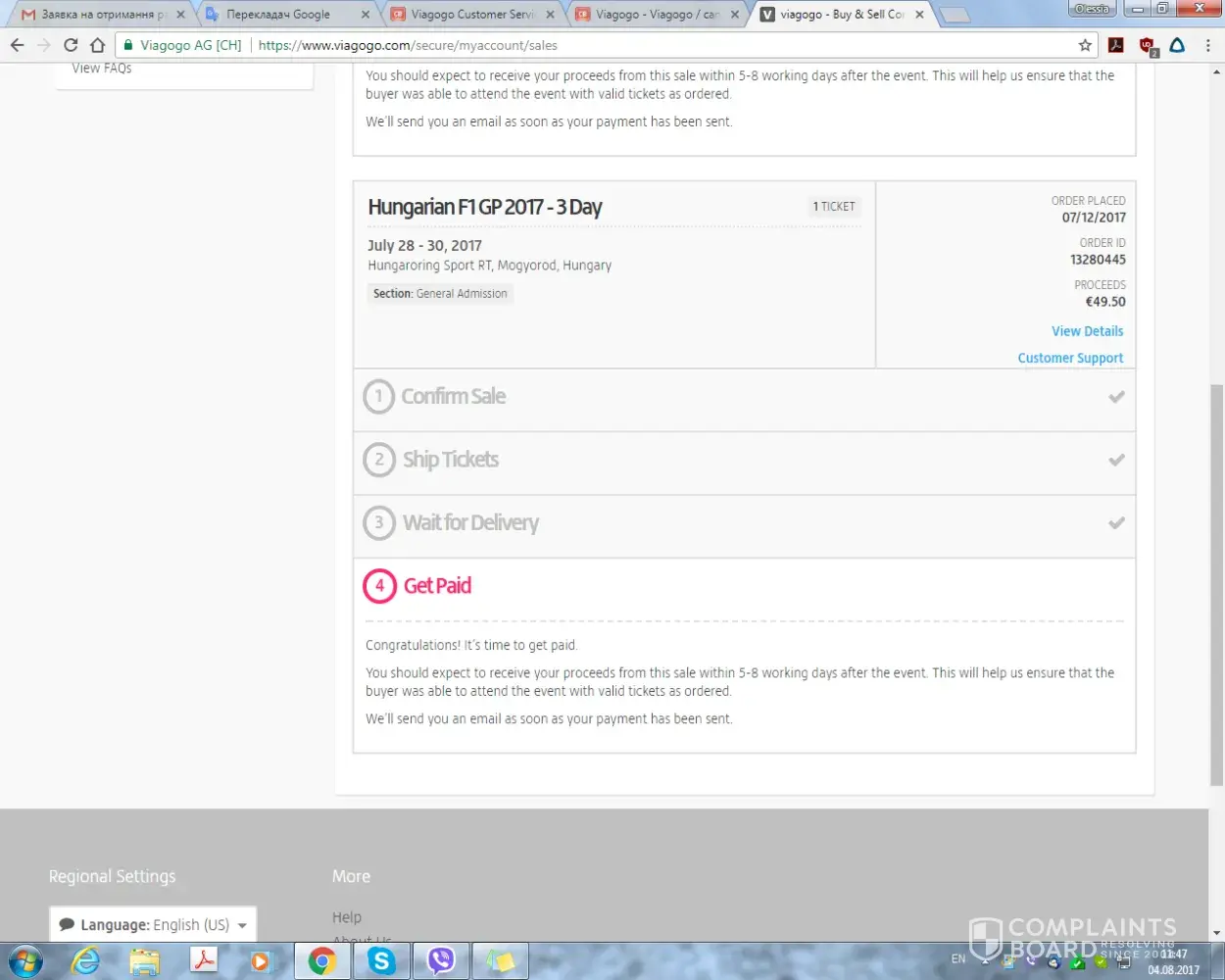 I have sold a ticket online on 24th May 2017 for an event on which took place on 4th August but have not received any payment til today despite the site saying that the payment is completed! Please assist me to get my payment! Order ID : [protected]! I understand that the term and conditions on the site stated that the payment will be in 5-7 days after the event takes place! But it is still not here and I'm getting anxious since its not a small amount.