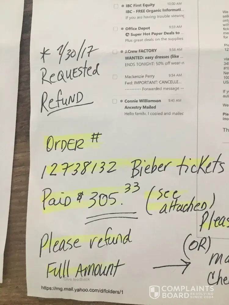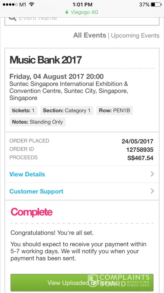 I'd like to make an official complain, as i was under the full impression, viagogo had tickets, and would be sending these to me, before the concert date.