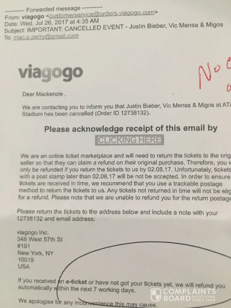 Received email from Viagogo on Jul 26, 2017 stating Bieber concert in Dallas, TX was cancelled and to federal express original tickets by 8/2/17. Instructions on email stated to federal express original tickets back to them by 8/2/17 for refund. I understood that