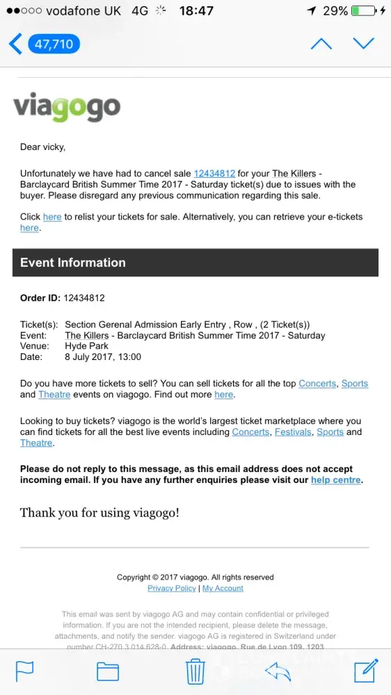 I was really excited when I purchased the tickets. A couple of days later, I noticed that the tickets had been cancelled by Viagogo without my knowledge.