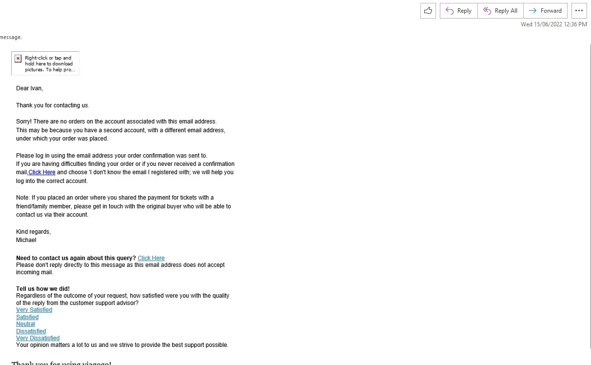 1. Received a message from Viagogo at 12:36pm AWST on 15/6 to say there was no record of purchase and to change my password. I immediately followed this instruction