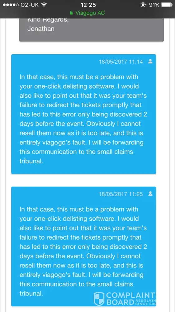 I will seek out my legal rights, and I will warn everybody from social media against Viagogo.