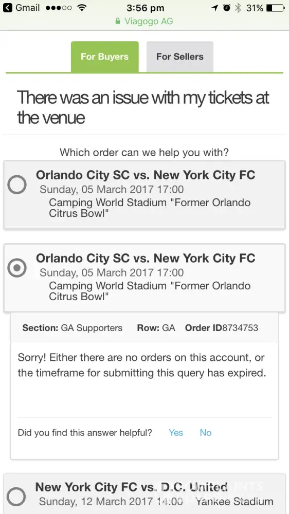 Hi I'm really dissapointed with your service, with the 4 tickets I purchased for the Orlando City Football Match.