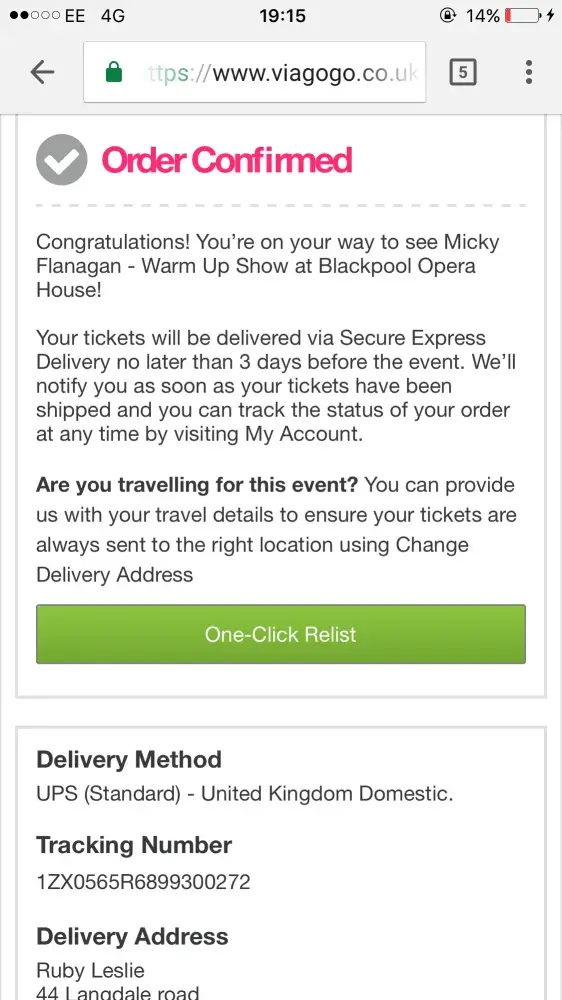 I order tickets and paid for them when putting in delivery address I put the wrong house number which I didn't realise I had done until I received email to say they had been shipped. The house number isn't valid so the tickets have been sent bk to viagogo I know this as I went down to local post office and they say u revived them Monday ! I have been trying to contact someone for 3 days on the numbers I was provided via the website I am unable to talk to someone reguarding my issue