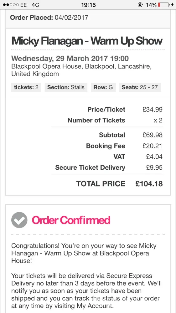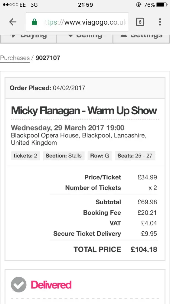 I bought tickets at around the 4th of february! Firstly I wasn't informed about the £30 booking fee so that was rediculous! Then I unclicked the box for secure delivery which was an extra £9 or so but still got charged. I am now finding out the tickets were on sale for £23 originally and with all the add ons I ended up paying £104 to then be told I can't get a refund. After this I waited and waited for my tickets which were for a performance on the 29th march. My tickets only reached the depo on the 27th march at 10pm. I then waited in all day for them on the 28th to be told they'd missplaced them at the depo and I had to drive to get them myself otherwise I wouldn't have got them until the day of the event! Viagogo gaurentees 'secure deliver' which I did not receive and didn't receive my ticket until less than 24 hours before the performance! This has cause me and my partner a lot of stress time and money we haven't got just for a pair of tickets! I am deeply disappointed and angry and I think I deserve some compensation! I have been so worried about these tickets all week and you have no customer service team to ring and this is the only way to get in contact with yourself! I request an email back about this matter. Thank you!