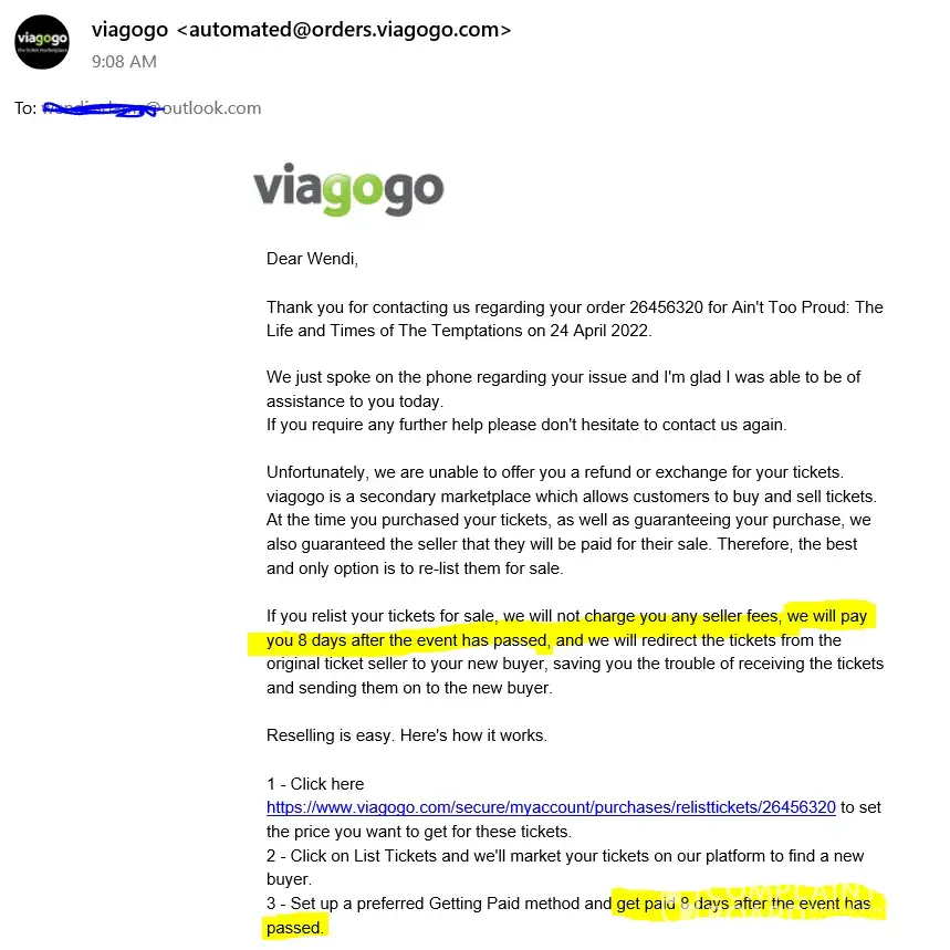 Viagogo refusing to cancel my order and give me a full refund.