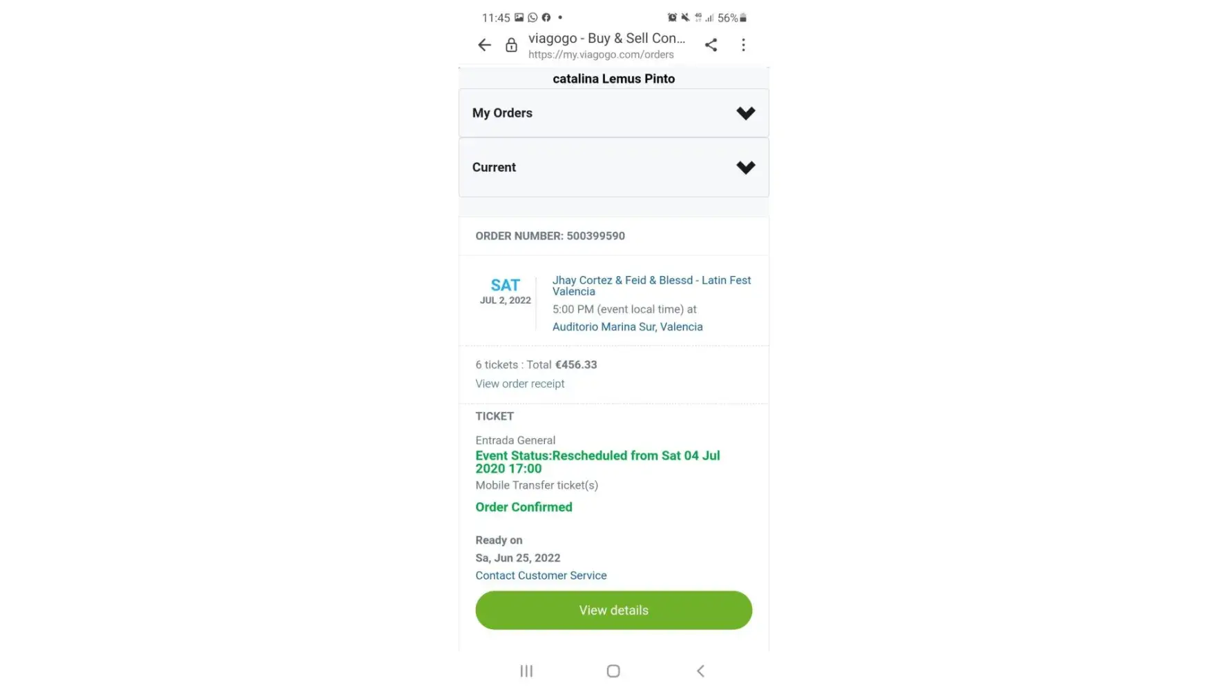 On April 19 my girlfriend and I have bought through Viagogo's website 6 tickets for the "Latin Fest" concert that will take place in Valencia on July 2, at the total price of €456,33.