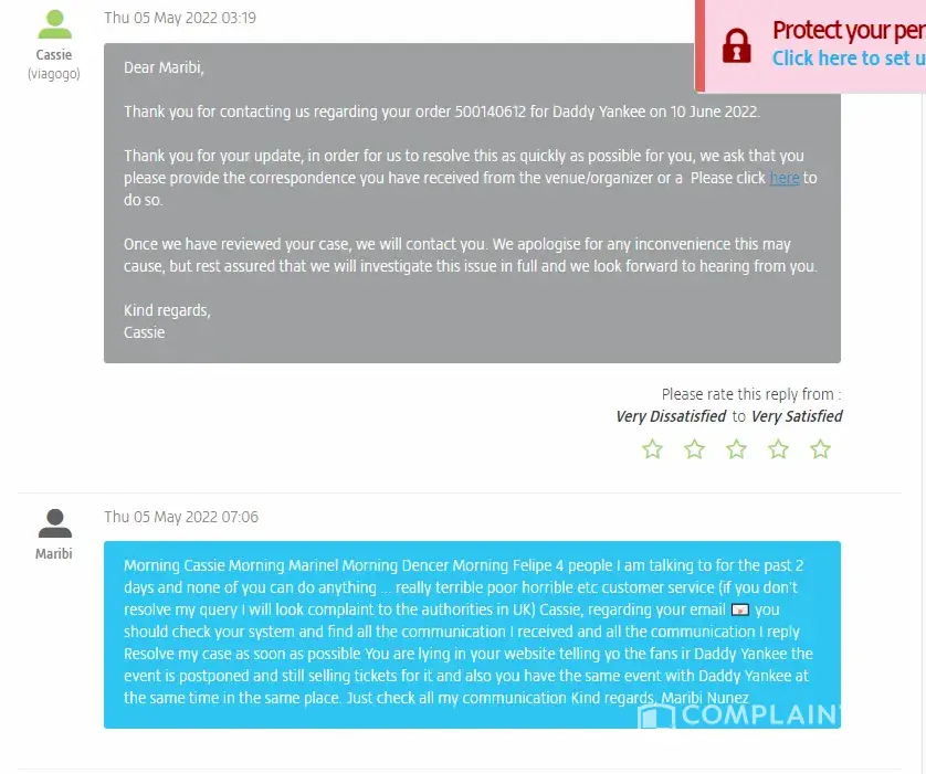 Curiously - the day after our complains - Viagogo changed the naming of the event, removing "Daddy Yankee" and replacing it with another artist's name (second screenshot attached to my complain here).