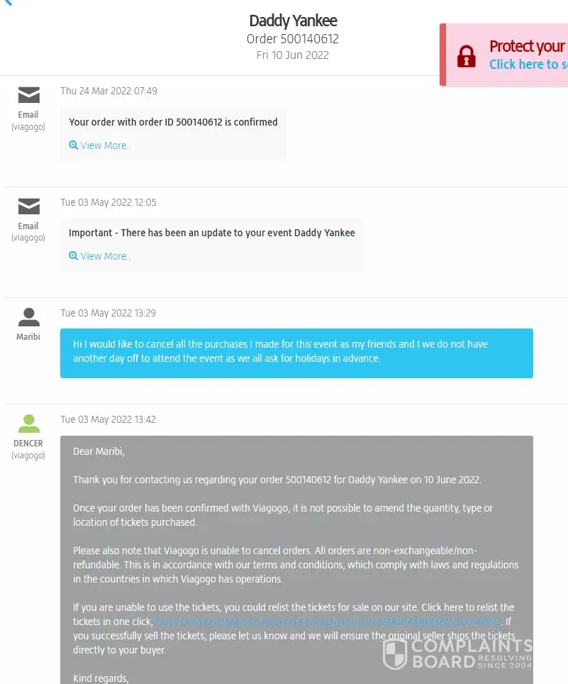 We got in touch then with Viagogo several times, explaining them that we had decided to purchase those tickets because of Daddy Yankee's presence, and that their website did misleading advertising - but they have rejected all our arguments, saying that we couldn't get a refund and that we could rather try to resell the tickets on their platforms.