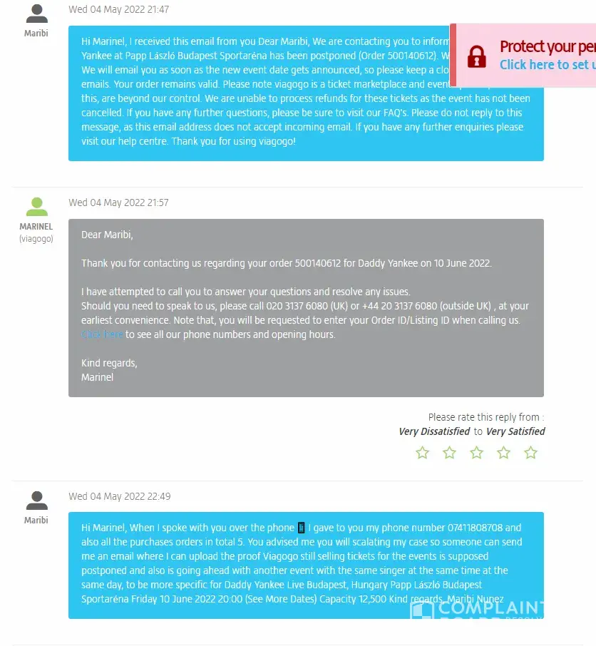 So I googled Viagogo.com and came accross many negative reviews, many news articles about their practices and how in some country the court ruled that their activities are ILLEGAL. I immidiately reached out to them to cancel my order and to give me a full refund. To this day April 17th 2022 they refuse when I send them messages on the "my messages " page. All the emails I've sent them are ignored. They also have claimed that they have called me when I had my phone right next to me and it didn't even ring.