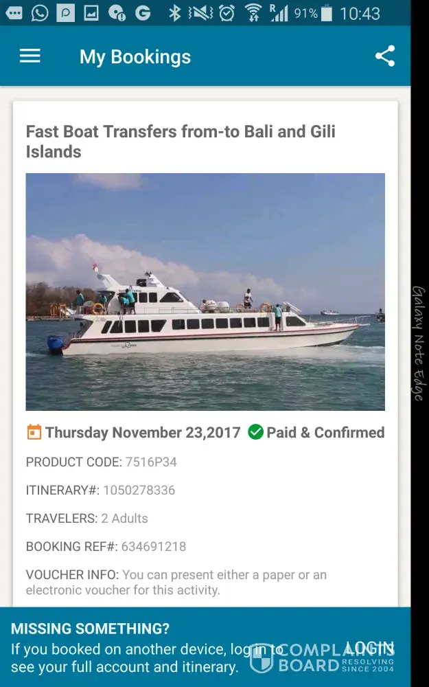 I booked a transfer from gili trawangan to seminyak and was not sent any information. In the information box on the booking I listep my hotel name and contact number. I also provided my number and my email address. As usual I normally receive a confirmation email to say the booking details. For this booking I received no information. I then used my hotel phone to contact the number provided in the booking screen. This number never picked up and that was the first worrying stage. I then arrived arrived the beach in the designated location to get the transfer and I was not able to locate my boat. I went to every boat and showed them my booking but none seemed to know which boat I was after. I ended up having to purchase a new ticket and I had a flight to catch in a few hours. The troubles caused me to miss my flight as the next available boat was not taking a direct route. After we got to shore we then presented with a 3 hour drive to the airport. This was double the original time suggested from my original booking.