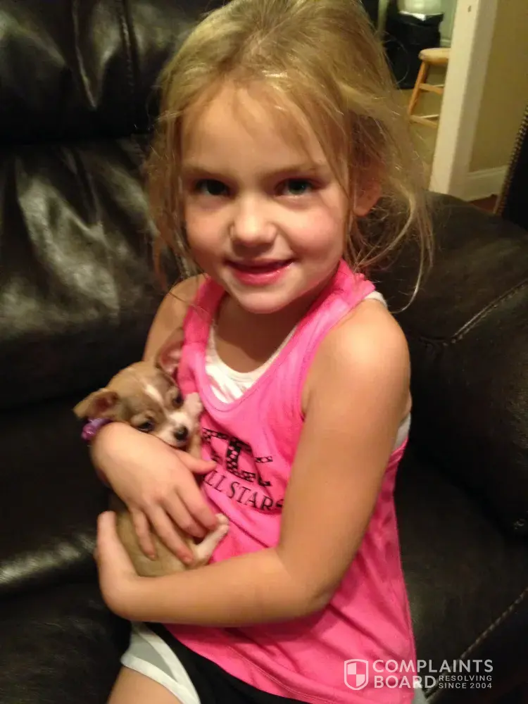 We called this number [protected] (Vicki maybe) and reported the issue. She informed me that she had fulfilled her obligations and was not liable for the puppies health. We took her back in, the vet put her on drips and then she took Lilly home with her Tuesday and Wednesday night, Lilly passed away on Thursday, August 14, 2014 at noon, while still in care of the vet. The vet feels as if the puppy was not of mature age and was sick the day my daughter picked her up, coupled with too much medication and her little system was just too week and too far drained for anything to help her.