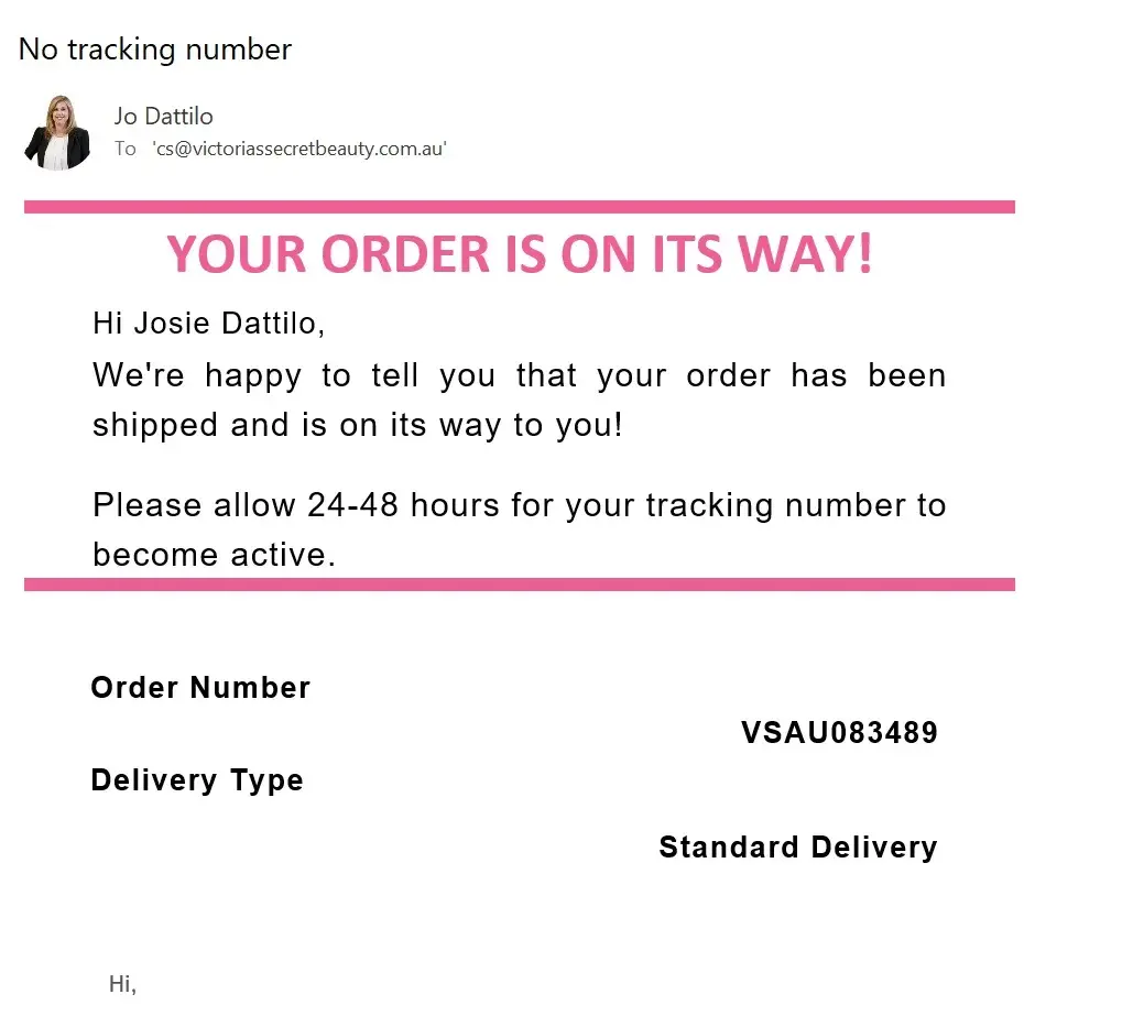 I have emailed cs@victoriasecretbeauty.com.au 5 times to get a response but all I get is what I believe is an automated response saying the following