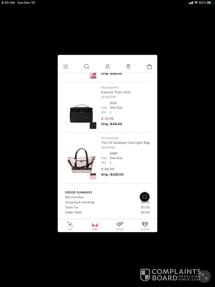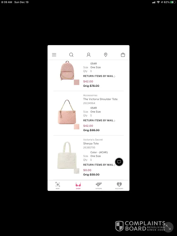 1. I ordered a few swimsuit pieces & SWIM through your online catalog, to my surprise none of them fit, even though I used your online sizing chart and measured myself before placing my order. Nothing fit upon delivery, which I returned immediately via mail. I printed out my own return labels from my home, using my computer and ink expenses. I was immediately greeted with a bill, and a past due amount from Victoria Secret. How could that be? I JUST returned the merchandise that I had recieved...