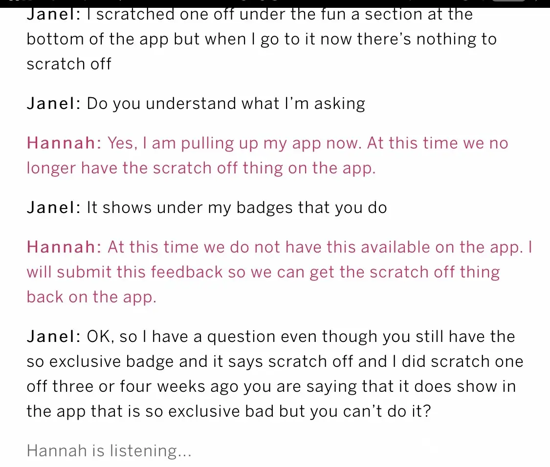 3. They didn't even want to look up any information on their computer about the question I was asking. I really thought that was weird because if she looked up badges or so exclusive badges on her computer or looked at the app herself she could have seen what I was talking about.