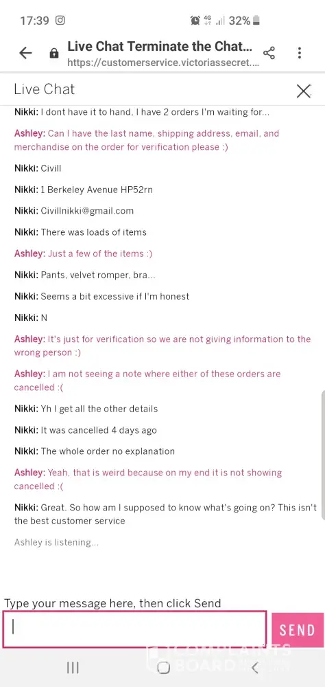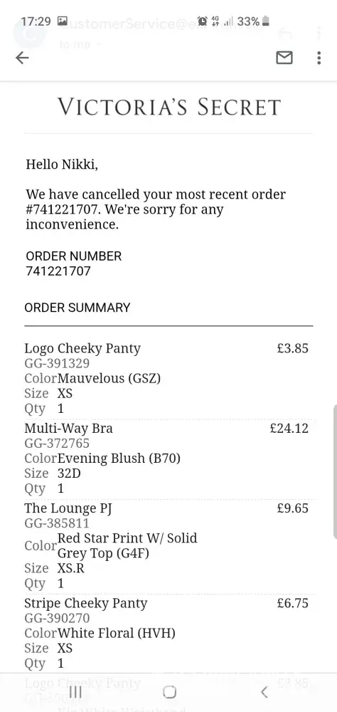 Where to even begin with this catalogues of monstrosities I do not know... I'll give it a good go. So i realised yesterday (11th) that my order had been cancelled 5 days before with no explanation or attempt at making the situation better. I engaged in a live chat with Ashley at 17:39 who told me there was no issue with my order and then failed to respond again with anything helpful, I can attach a screen shot of where the conversation was left. Not being satisfied with that I tried again at 18:33 and spoke to Cindy who instantly told me there had been a processing error and I was welcome to re-order. After I advised her I didn't wish to and I would like any outstanding orders cancelled she advised that she couldn't stop the orders and I would still receive them AND keep the items and that would be confirmed via email within an hour... Had a feeling it hadn't been done and no email still the following morning so I contacted the 0800 234 0481 number at 7am this morning and spoke to Kaitlin who after 7 minutes was no use what so ever and told me I was telling her the order number incorrectly so I asked to speak to her manager. Kaitlin had me on hold for ages and came back with no manager. Still arguing the order number wasn't valid and that she was discussing it with her supervisor, even though I specified a manager. Anyway after nearly 45 minutes Kaitlin finally provided me with an email address for me to send the screenshots to and she recieved them and STILL tried to pick fault which I'm sorry made her look a complete idiot. I even questioned her as to if she felt silly accusing me and she couldn't answer. An hour and 10 minutes in I FINALLY get the pleasure of speaking to Kaitlins supervisor who's name wasnt even worthy of remembering decided to hang up on me. I then rang the Bristol store I'd visited last Thursday to see if they could off any help and spoke to the sweetest young lady called Emily who couldn't apologise more if she tried bless her who informed me the top port of call was the number I'd already been hung up on or this email... so failing this I will be contacting the ombudsman as I've been made fully aware all calls recorded and I'm certain Victoria Secrets have failed me miserably. If some one would kindly contact me asap I'd be extremely grateful.Â