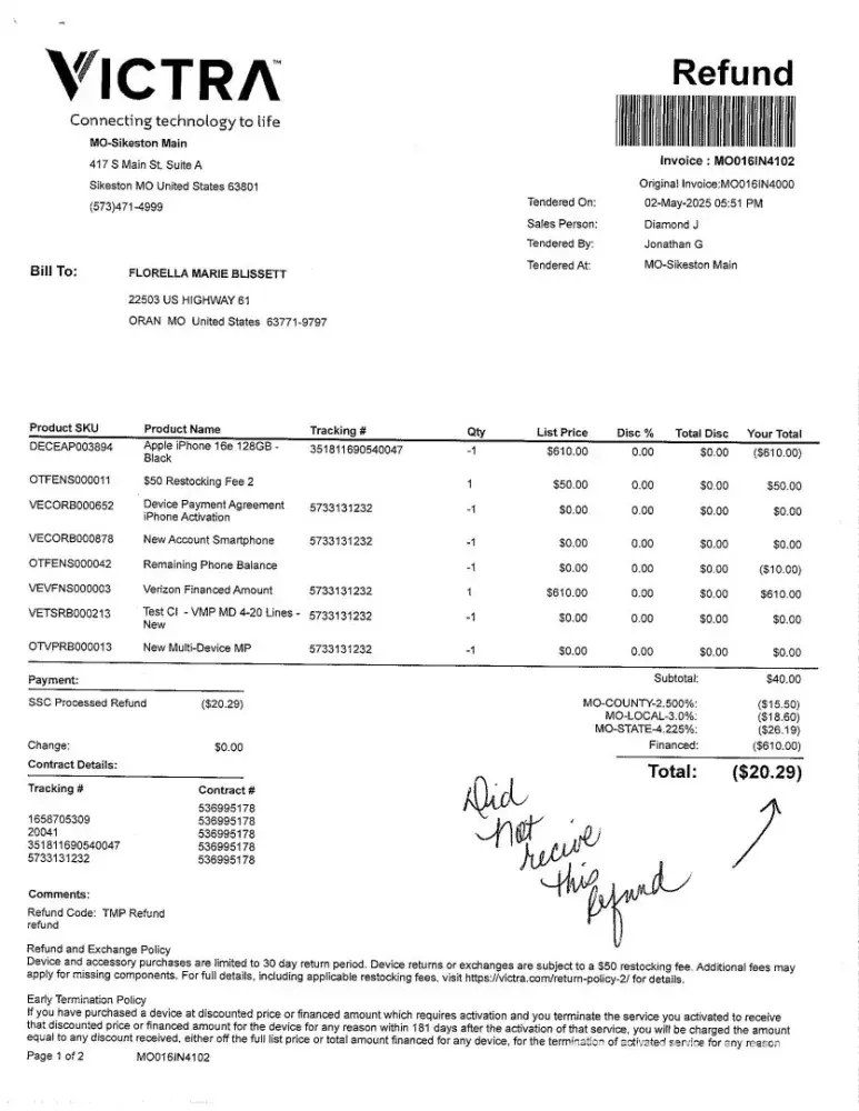 I purchased 4 mobile phone on a offer 4/2025. 2 of phones were returned in 2 weeks. phone 3,4,were returned before 30 days were completed. I received return for first 2 phones by check, the problem starts with the last 2 Apple phones. apple E was accepted in store, apple pro max 16 was returned to Verizon warehouse because wrong EMI was scanned during...