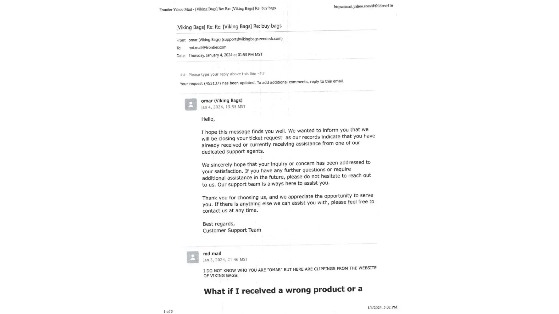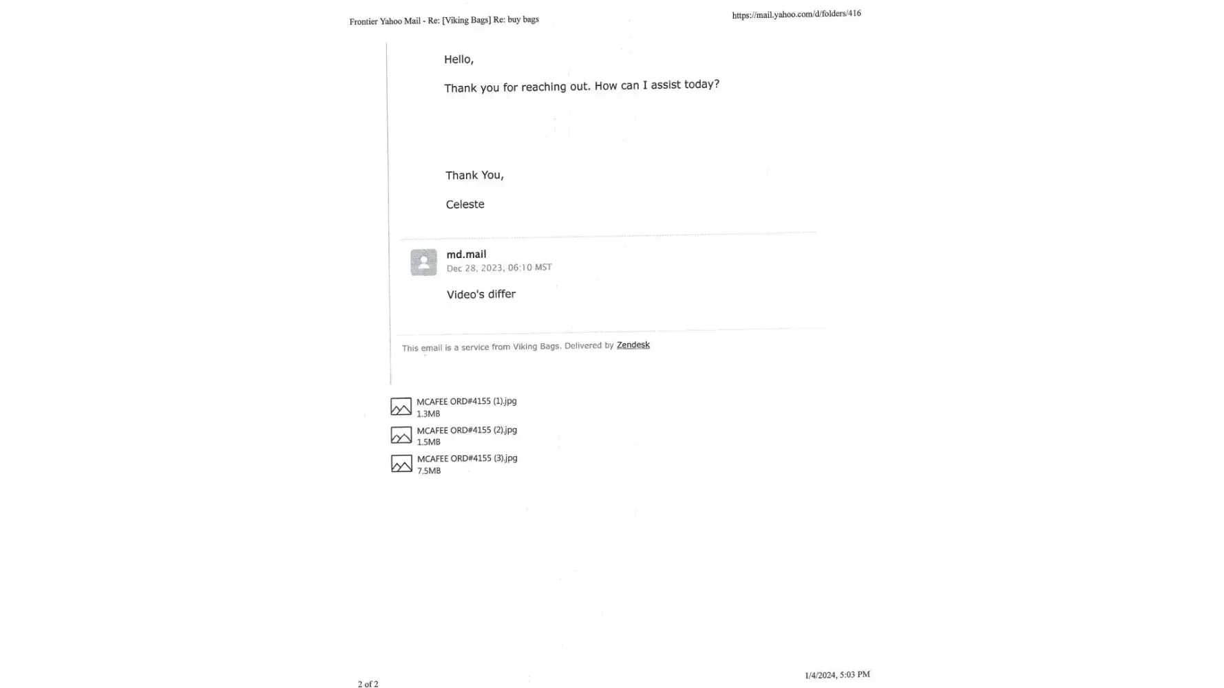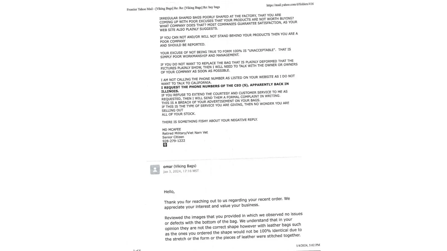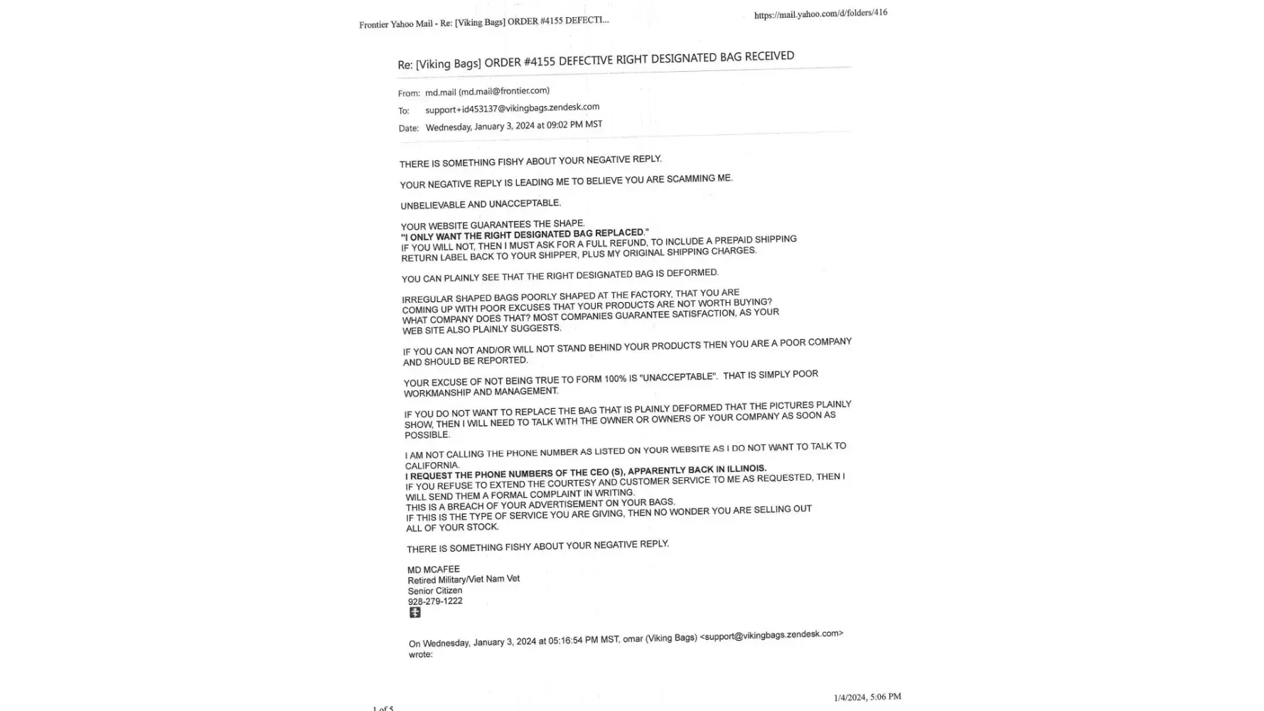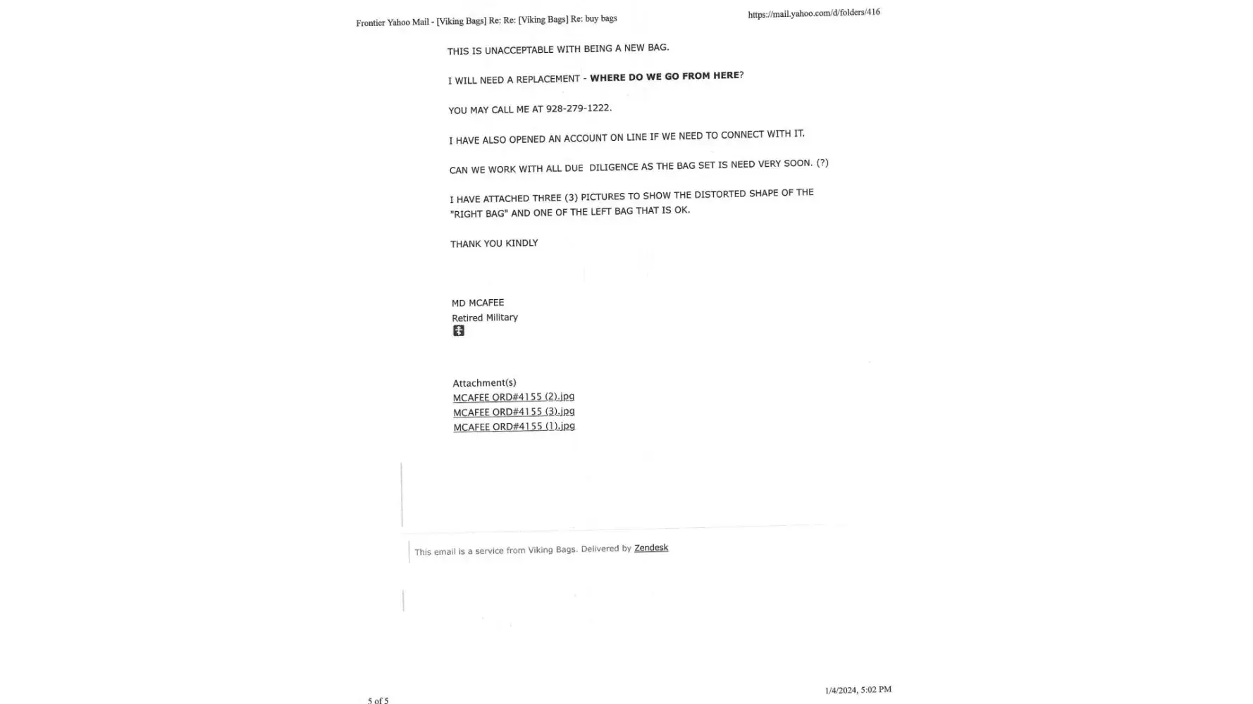 I am attaching pictures of the bag (s), as well as the correspondence throughout this journey. My last conversation was actually a verbal on the phone with “Omarâ€, a supposed agent, who called me in a brainless effort to entice me to accept defective/warped products from them.
