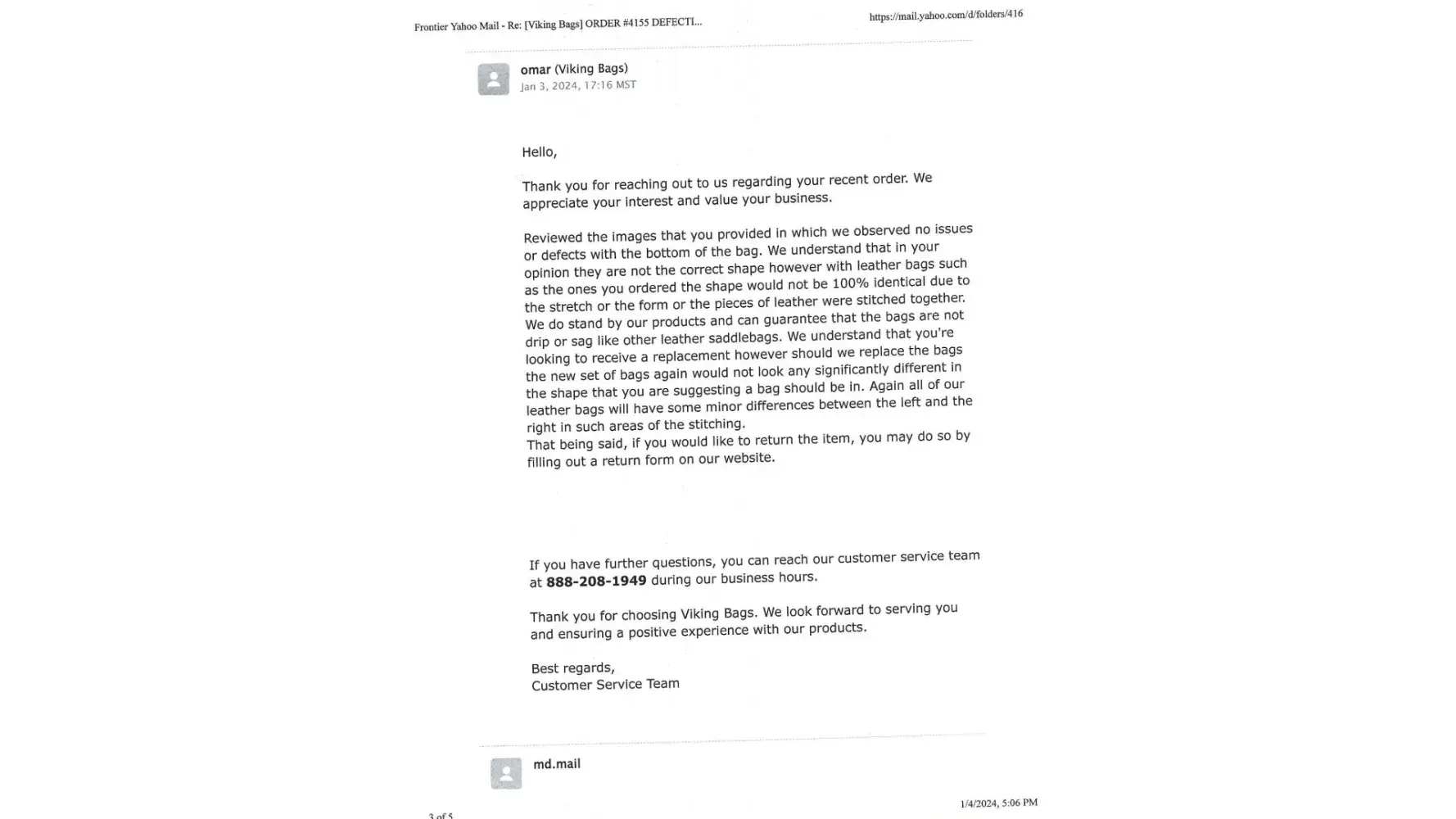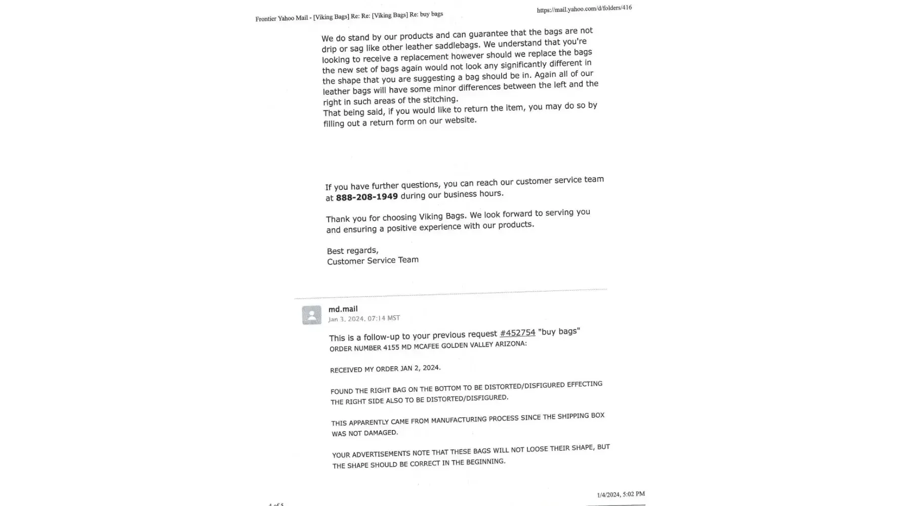 My simple request to them was to “exchange/replace†the “right side saddle bag†for one that is in the shape it was designed to be in. As their website plainly states they will “refund/replace/exchange†the product at no charge to the customer/buyerâ€. (Please read the websites “Exchange/Returns Policies†in two places at the bottom of the home page . You will find order information and emails in the attachments hereto.