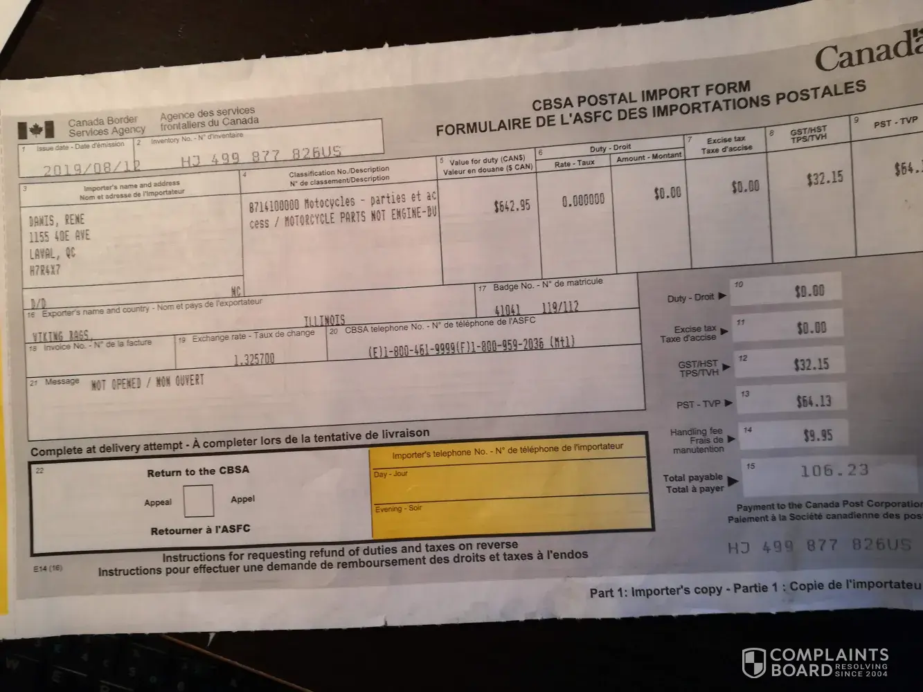 Ordered online on August 2nd, I did not receive the order until August 16t has the package was intercepted by Canadian Customs and charged me an additional cost of $106.23 in Canadian currency (documentattached).