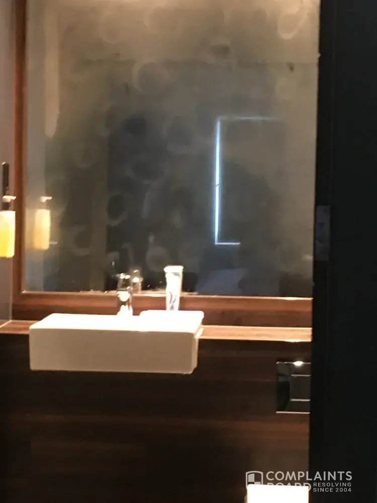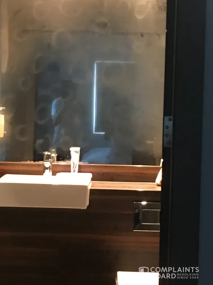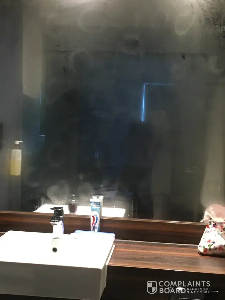 This is our bathroom mirror we complained and was told it would be deep cleaned. It wasn't. The manager was going to give us a call he didn't. I've made plenty of calls and mails to no avail. We stayed in Bournemouth on26/7 just after lockdownI was lifted. So we would expect extra cleanliness in order to avoid contamination We were advised that why we were out the room would be deep cleaned It wasn't there was dust and dirt everywhere the floor we were on was filthy there was a bucket collecting water from a leak on the roof it was never hoovered in the time and that we were there to the time we were left I am really disturbed at the fact that I've made this complaint to the actual hotel manager to village hotels complaints department and nothing has been even resolved or anybody contacted me about this I'm about to put a very rude review on TripAdvisorI shall not be going to Bournemouth Village Hotel ever it was disgustingly dirty not a place I would want to stay ever again please could you contact me at your earliest convenience on [protected]