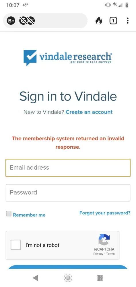 I have been a client of vindale research for about 5 years. This problem has been going on for about for at least 6 weeks. The problem is on your end. It seems that every time I try to log in to my account I keep getting this stupid message (error for site owner, invalid domain for site key). Ever since I first signed up I have had to access my account thru facebook and now I an't even do that. I have approximately $46.52 in my account and don't feel like loosing it or starting over with another email address and password.