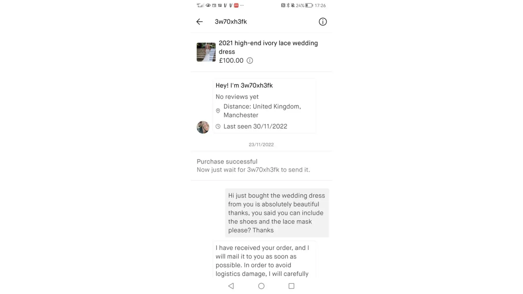 I bought a wedding dress in vinted and the item never arrived I don't know how the transaction actualize to order complete when in the tracking number they clearly can see the item is not been delivered I been in contact with Evri and they admitted they don't been able to delivery the parcel but I still ending up losing my money with not right to refund. I will contact traders standards tomorrow because this it is not fair