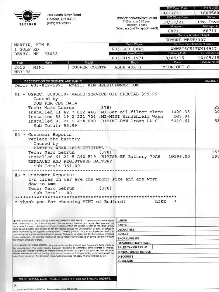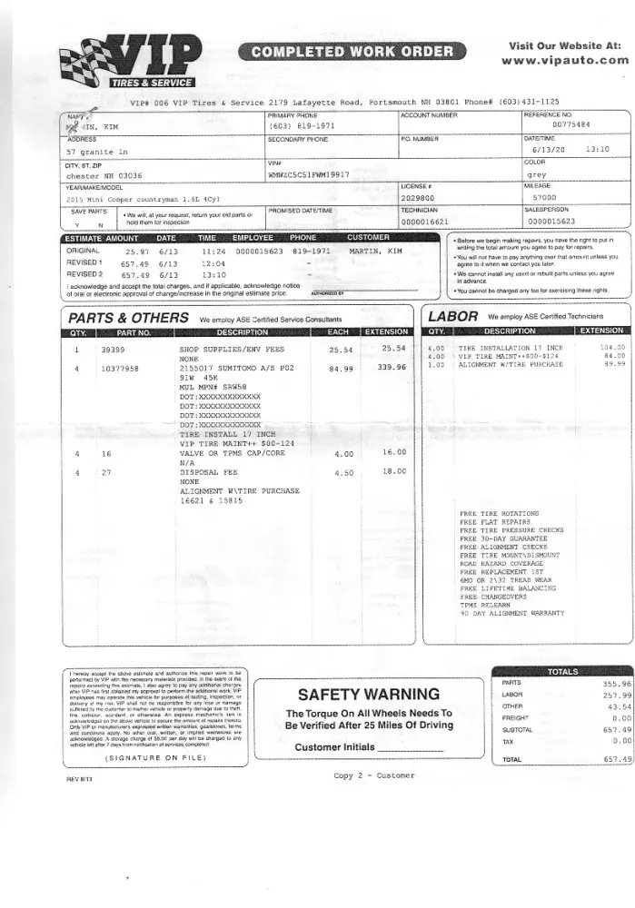 I have uploaded the original receipt from VIP Tire as well as the service record at dealership indicating the issue.