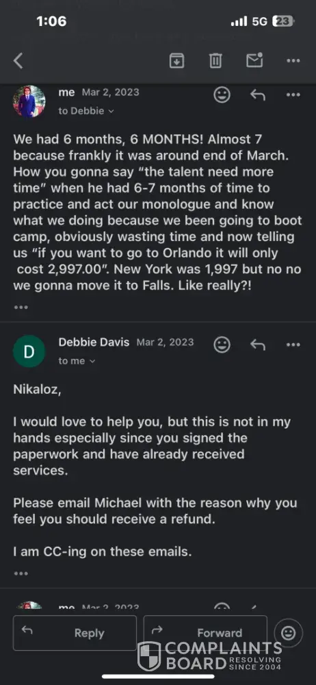 Then she said I had to pay something around $750 for an event held in August. She said big entertainment record labels attend this event looking for talent and that I could perform and network. Red flag number 3: she refused to give me any names of these "promised" record labels and people in attendance. We also discussed a payment plan after I mentioned I only had $70 on me at the time. She said I had to pay $100 today in order to go any further, which was RED FLAG NUMBER 4. No real company will demand an immediate payment. They will allow you to take the contract home for a few days to look over it and review it with your lawyer, but not VIP Talent Connect, because they're a scam. So she took my $70 in cash and demanded I give her my debit card for the other $30. After I did that, I signed the contract AND THEN she told me I had only 7 days to pay the full $750 or whatever ridiculous price it was. My stomach dropped. I felt tricked, but she seemed unconcerned about what she had just done. Immediately after paying, she said goodbye and pushed me out of the office. There was no further information provided, no handshake, no connection established. She was cold, firm, and definitely a scam artist. I left feeling sick and started crying. I called my parents and explained what happened and that's when we found something on the contract where it said we had 24 hours to cancel via phone or email. Of course, NO ONE answers the phone. I don't remember how exactly I got out of the contract, but I did that day.