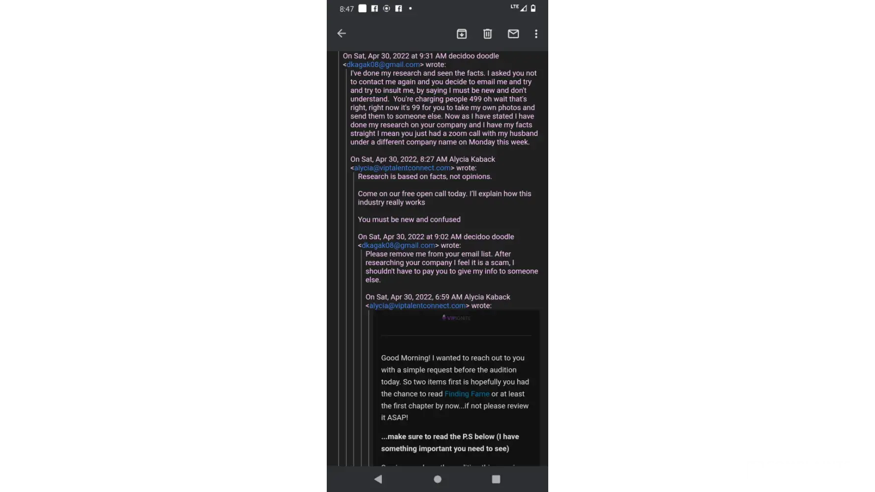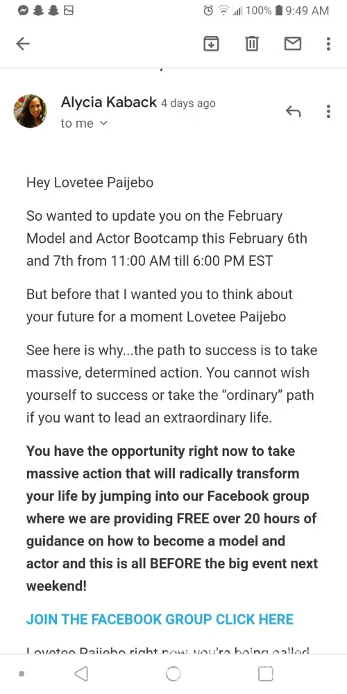This company is a complete scam and I wish I would have realized before I went through with this event. One day I received a message from Alycia Kaback, the CEO of VIP Ignite, about auditions with the tv show power. This was a few months after my mother passed away. The email seemed legit and I didn't think twice since I was hoping a few days ago that an opportunity similar to this one would come up. I contacted the company and was set up with an online interview. I usually could fish out a scam but these companies are becoming so believable these days. I was asked a few detailed questions about me and my talents. The face of someone who seemed nice and caring made me believe it was all real. I was told that the event helps you connect with important people in the industry.